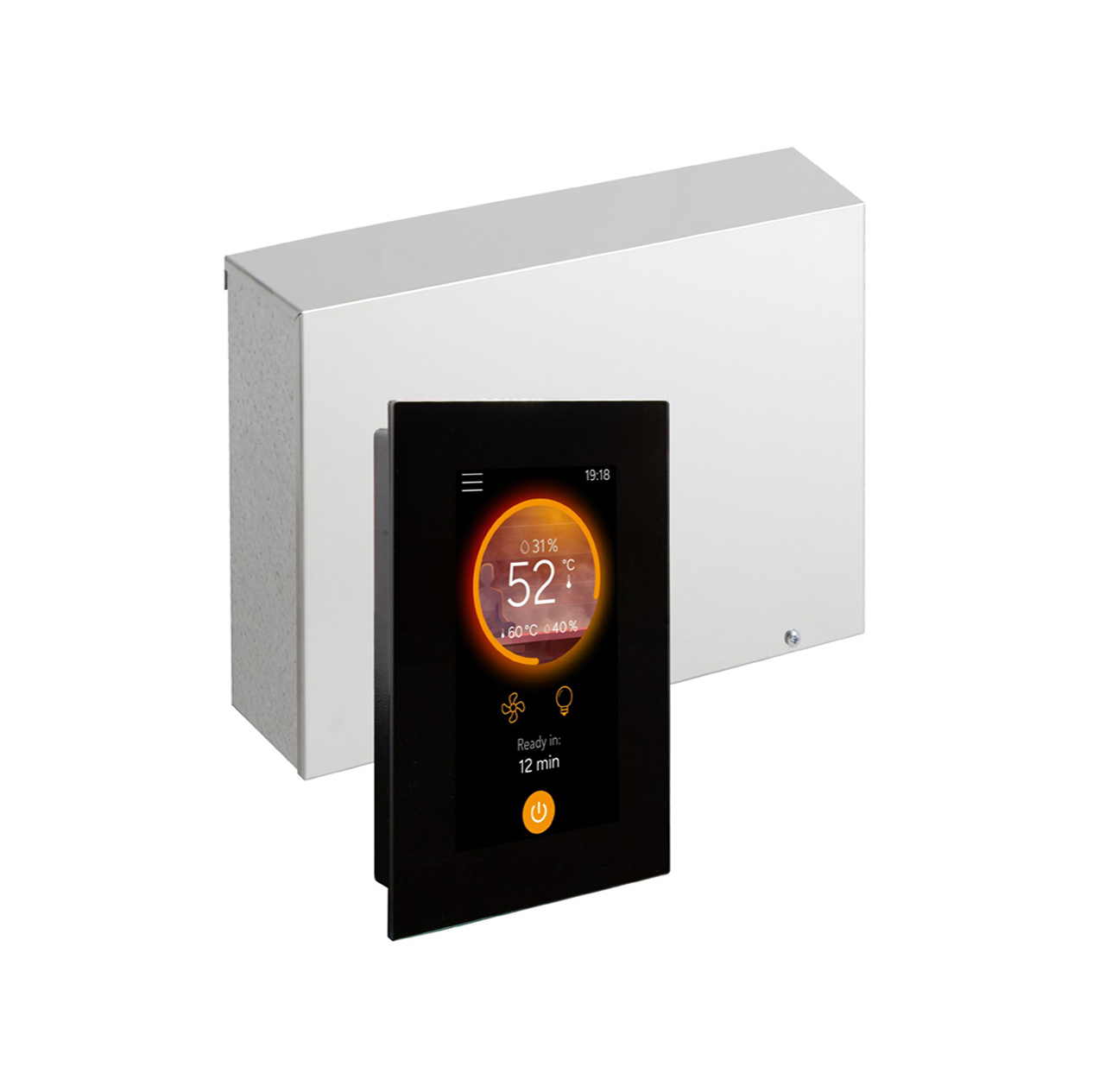 Het glazen touchscreen kan zowel opbouw als inbouw worden geplaatst en is geschikt voor montage in de sauna, badkamer of woonkamer. De interface heeft dezelfde uitstraling als de MyHarvia 2-app en toont wanneer de sauna klaar is voor gebruik.